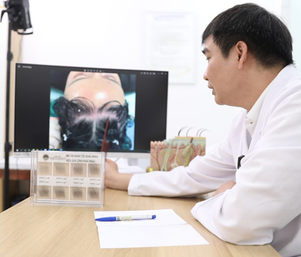 Khi chị đến phòng khám thì được bác sĩ soi da đầu trực tiếp, chỉ ra vùng tóc thưa, đặc biệt là vùng trán và đường chân tóc. Nhìn rõ tình trạng của mình trên màn hình chị mới hiểu vì sao tóc càng mỏng như vậy mặc dù bên ngoài vẫn còn tóc.